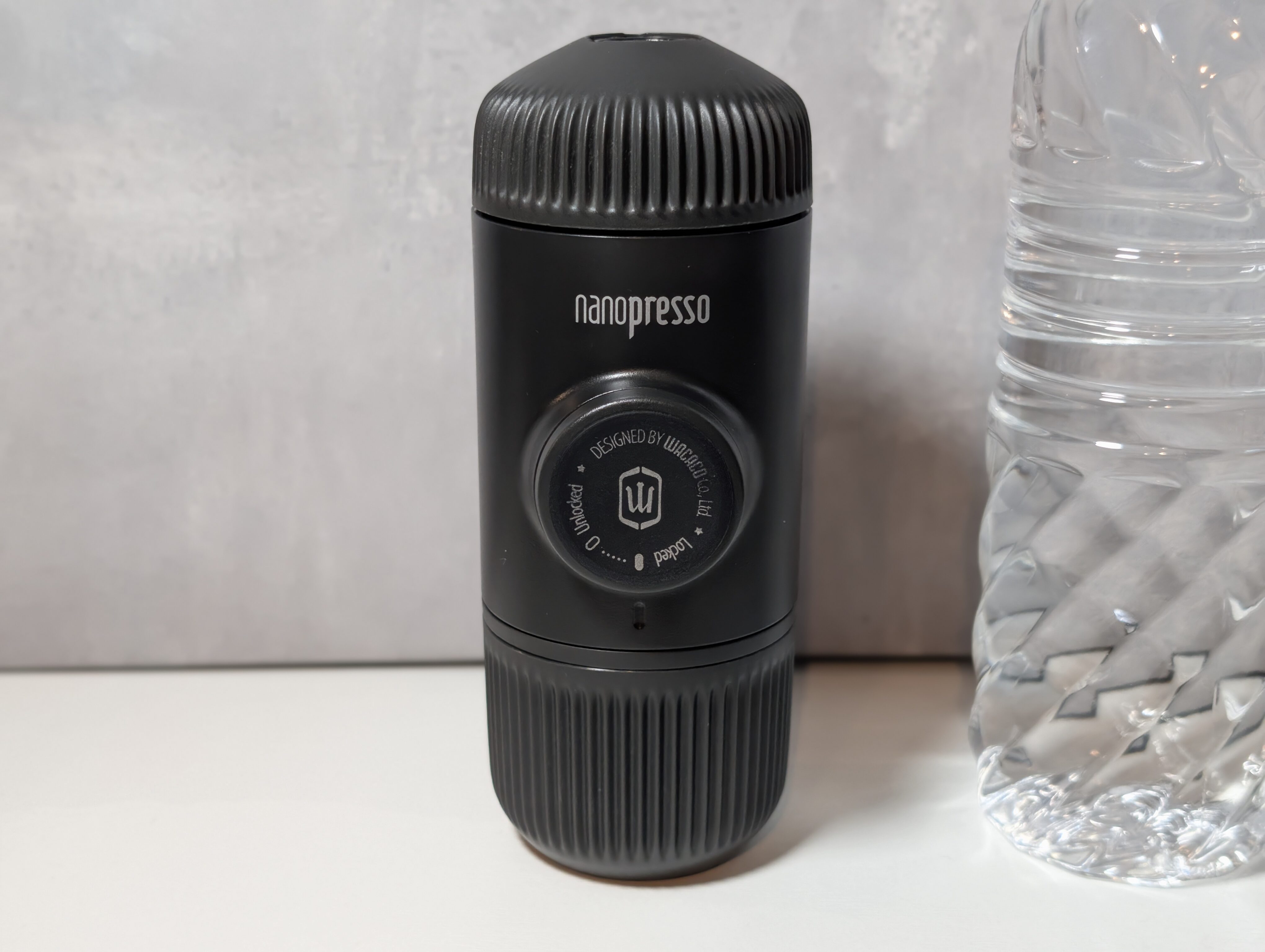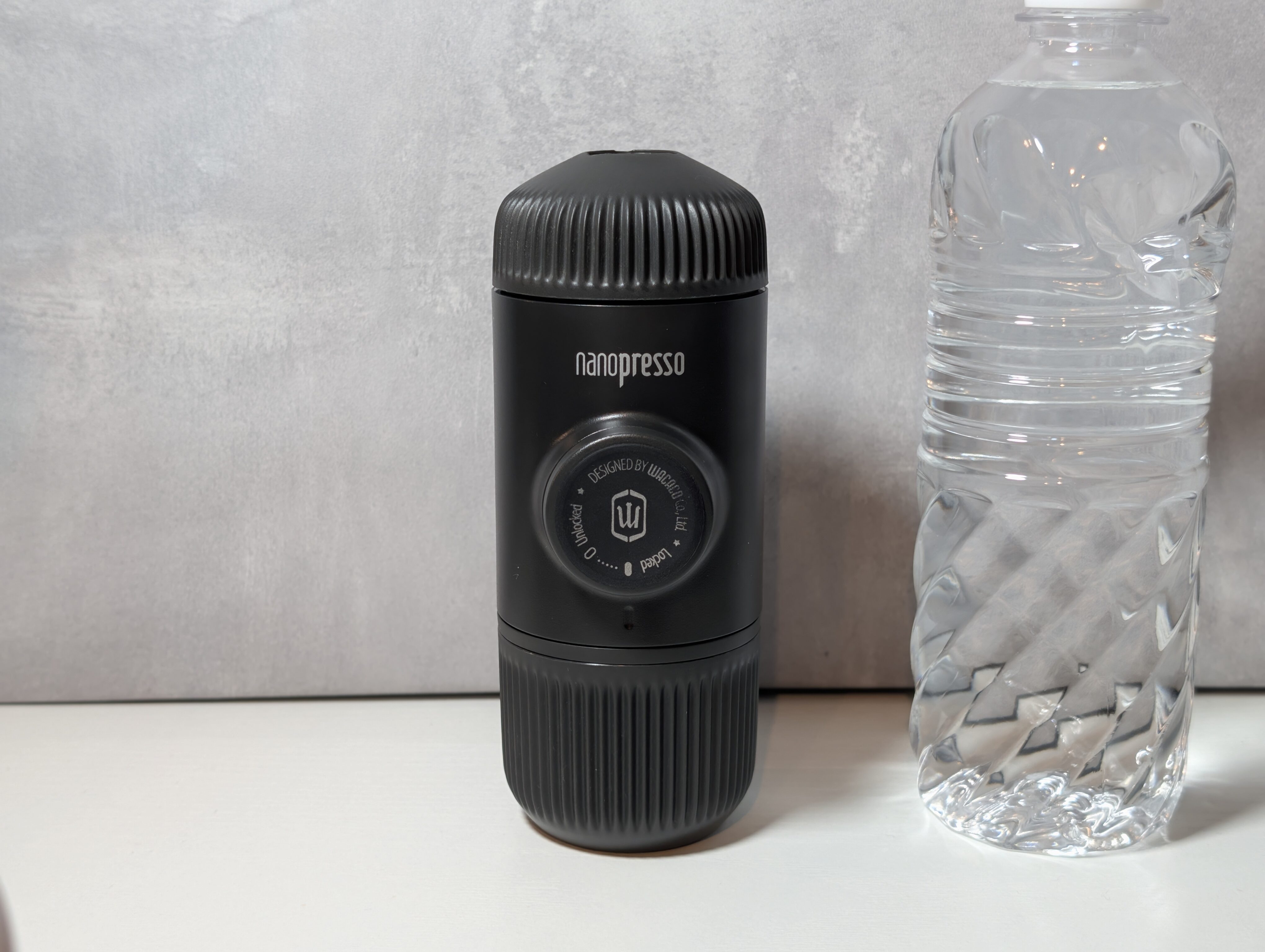 この条件で最初に見つけたのが、香港発のコンパクトエスプレッソマシーン専門メーカー「WACACO」の「Nanopresso」です。1万円以下で購入でき、500mlペットボトルより小さいサイズながら、それなりの圧力でエスプレッソを抽出できる手動式マシーンです。飽きてしまう可能性も考え、まずは手ごろなこちらを試してみることにしました。